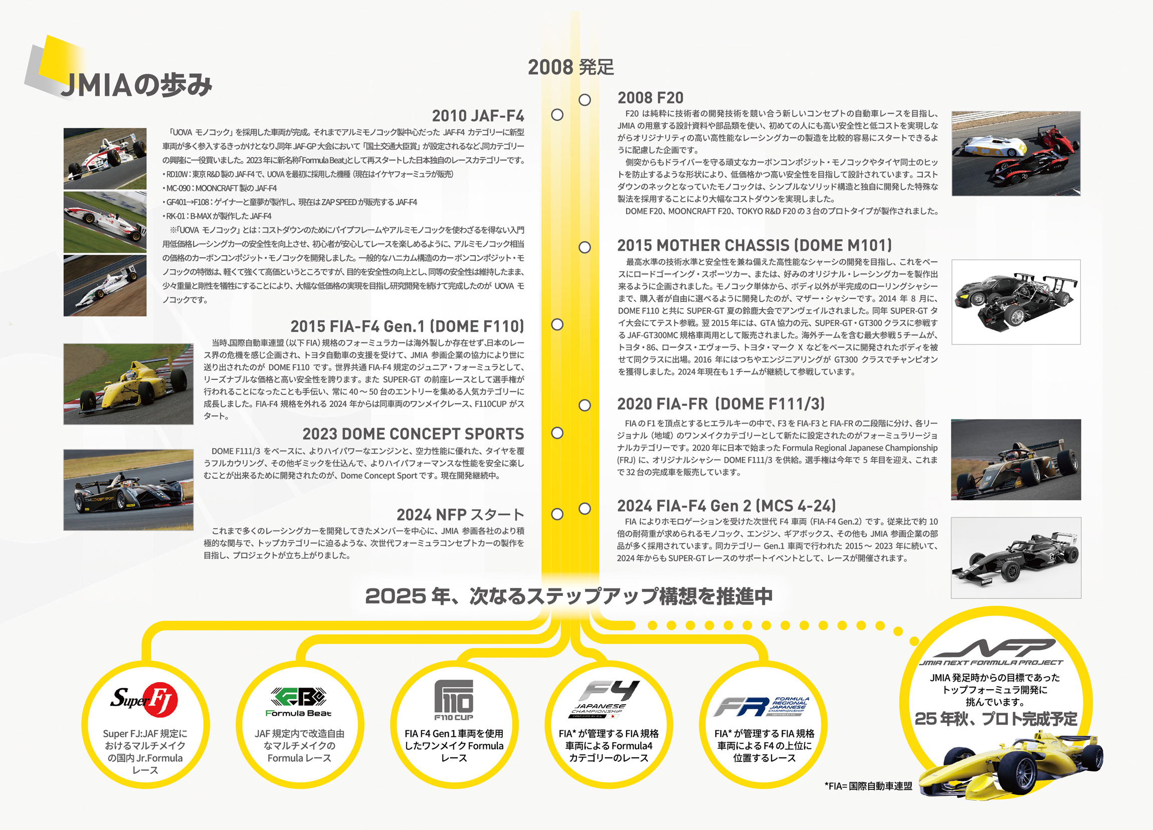 当時、国際自動車連盟(以下FIA)規格のフォーミュラカーは海外製しか存在せず、日本のレース界の危機を感じ企画され、トヨタ自動車の支援を受けて、JMIA参画企業の協力により世に送り出されたのがDOME F110です。世界共通FIA-F4規定のジュニア・フォーミュラとして、リーズナブルな価格と高い安全性を誇ります。またSUPER-GTの前座レースとして選手権が行われることになったことも手伝い、常に40~50台のエントリーを集める人気カテゴリーに成長しました。FIA-F4規格を外れる2024年からは同車両のワンメイクレース、F110 CUPがスタート。